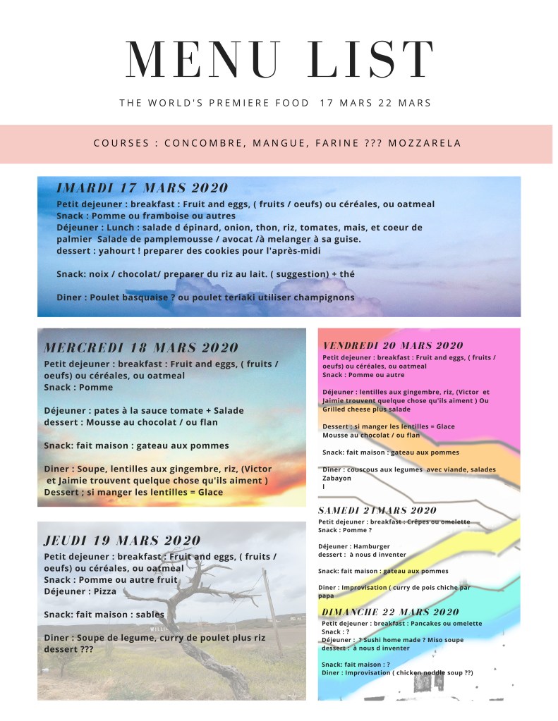 Sunday I had prepared a very flexible schedule for the kids and me… Monday we started the day by setting up homework stations etc, and start the homeschooling and working from home process. It was hectic day but we had most of the important things done. Monday night I decided to write down a better structured one and some ideas and menus ( menus both to use well what we have at home and not to think too much 3 times a day at what to prepare).